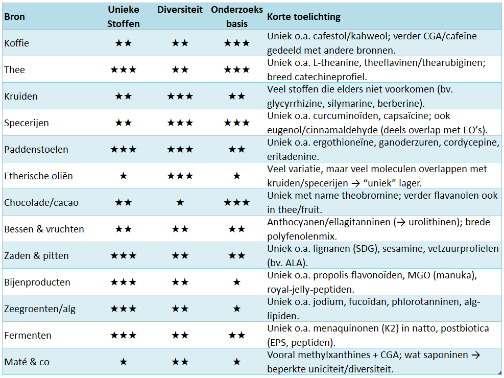 - Overig: theofylline (sporen), biogene aminen (o.a. PEA), mineralen (Mg)